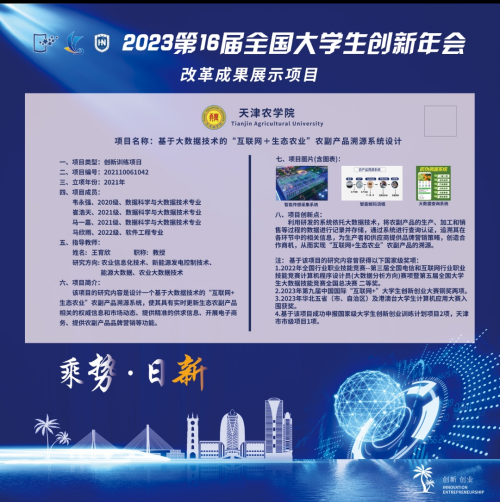 该项目于2021年立项,项目组主要成员由王育欣教授指导的智能控制与大数据技术团队的学生组成,项目积极与涉农企业和农业种植基地合作,旨在通过大数据技术实现农副产品的全程溯源,系统将采集农业生产过程中的各类数据,通过区块链技术确保数据真实可信,再运用大数据技术对数据进行分析处理,实现农副产品的来源、生长过程、加工处理等信息可追溯,从而为消费者提供更加透明、可信的农副产品信息,推动生态农业的可持续发展。智能控制与大数据技术团队的学生成员基于项目的研究内容共申报大学生创新创业项目国家级3项(其中结题2项),市级1项;已获得国家级荣誉6项,省部级荣誉10余项,发表相关论文6篇,授权专利、软件著作权7项。同时,该项目作为永利3044官网重点培育项目先后受邀参加北京大学创业训练营、走进天开园研学交流活动专题讲座及优秀项目路演等活动。