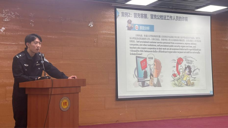 白宇警官针对当前电信网络诈骗案件高发态势,以典型案例为教材,运用通俗易懂的语言以案说法,为同学们详细讲解了电信网络诈骗的种类、手法、预防方法等内容,让同学们充分了解了刷单、网贷、裸聊、冒充电商客服、网络交友等在学生群体中多发的诈骗类型,呼吁大家了解最新骗术手法,不要轻易相信陌生人,保障自己的财产和安全。