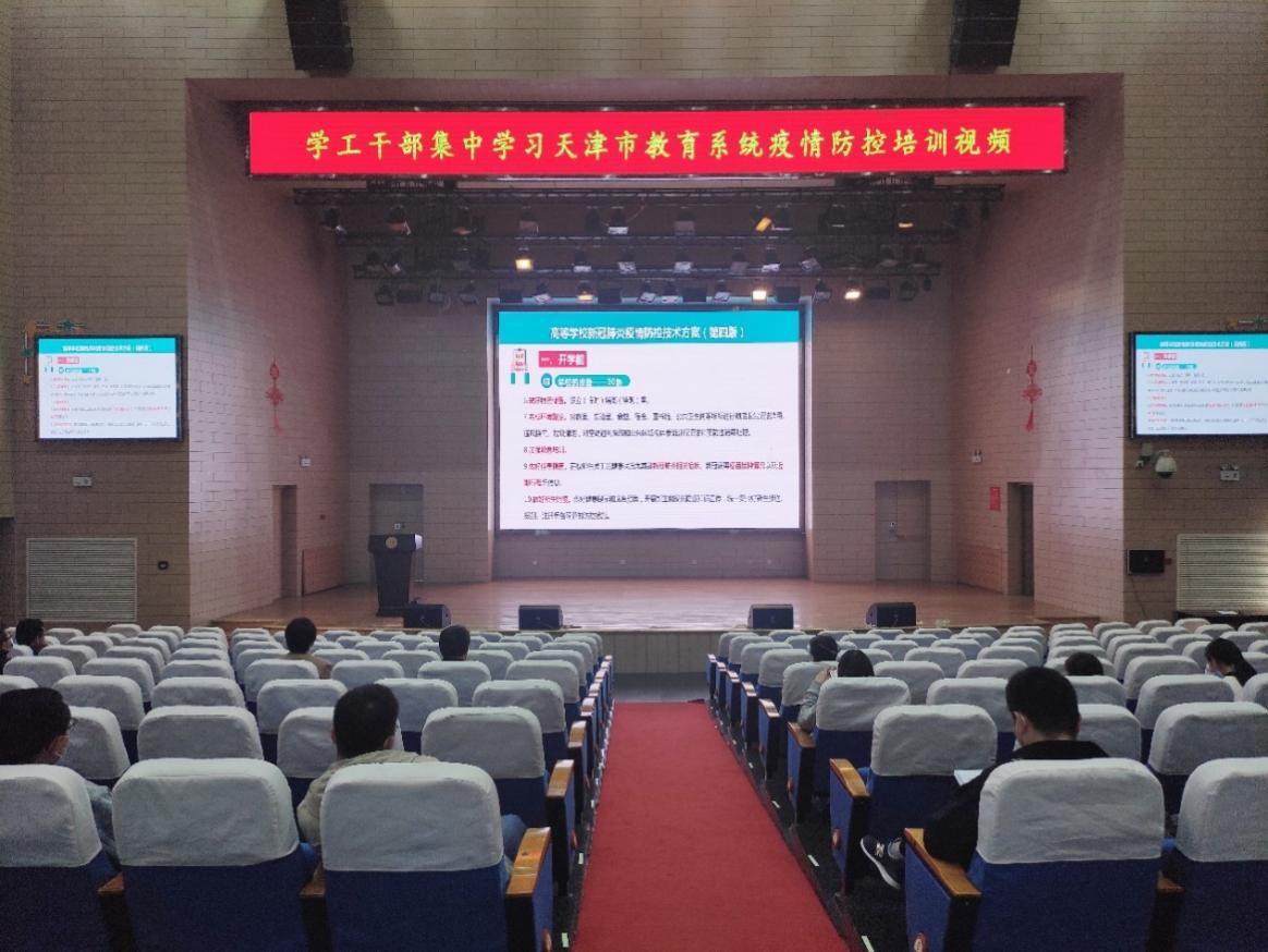 10月13日下午,学工部组织全体学工干部、宿舍物业管理人员集中观看由市教委、市卫生健康委、市教科院联合录制的天津市教育系统疫情防控培训视频。