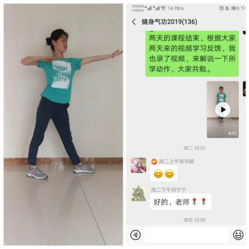 开学首周,23位体育教师组建了202个体育班级微信群,在线学习的总人数达6004人,老师们共制作教学视频270余期,纠偏纠错1500余人次,师生在线互动5000余次。老师们采用微信接龙、知到签到等方式进行考勤管理,以录播、线上教学视频等方式提供学习资料,针对学生反馈练习视频教师即时点评纠错,积极与学生进行线上互动,整个教学过程丰富多彩。