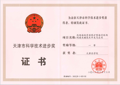 永利3044官网郭永军研究员参与完成的《浅滩海域资源养护型海洋牧场构建关键技术开发与应用》项目获得天津市科技进步一等奖