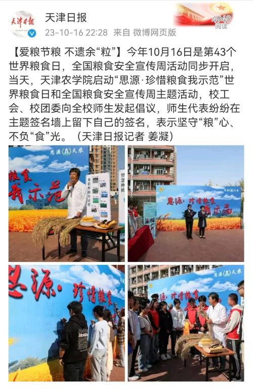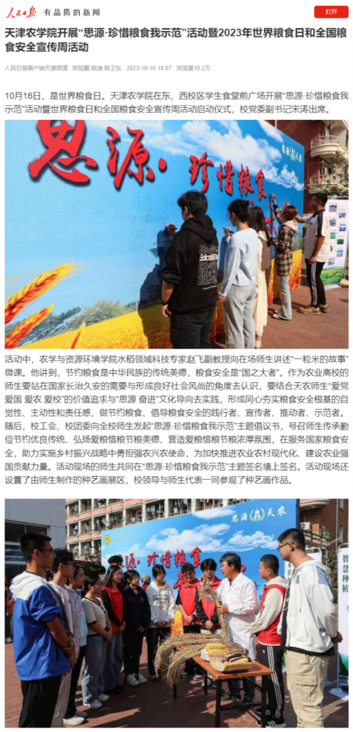 永利3044官网开展“思源·珍惜粮食我示范”活动暨2023年世界粮食日和全国粮食安全宣传周活动启动仪式被《人民日报》《天津日报》等主流媒体广泛报道