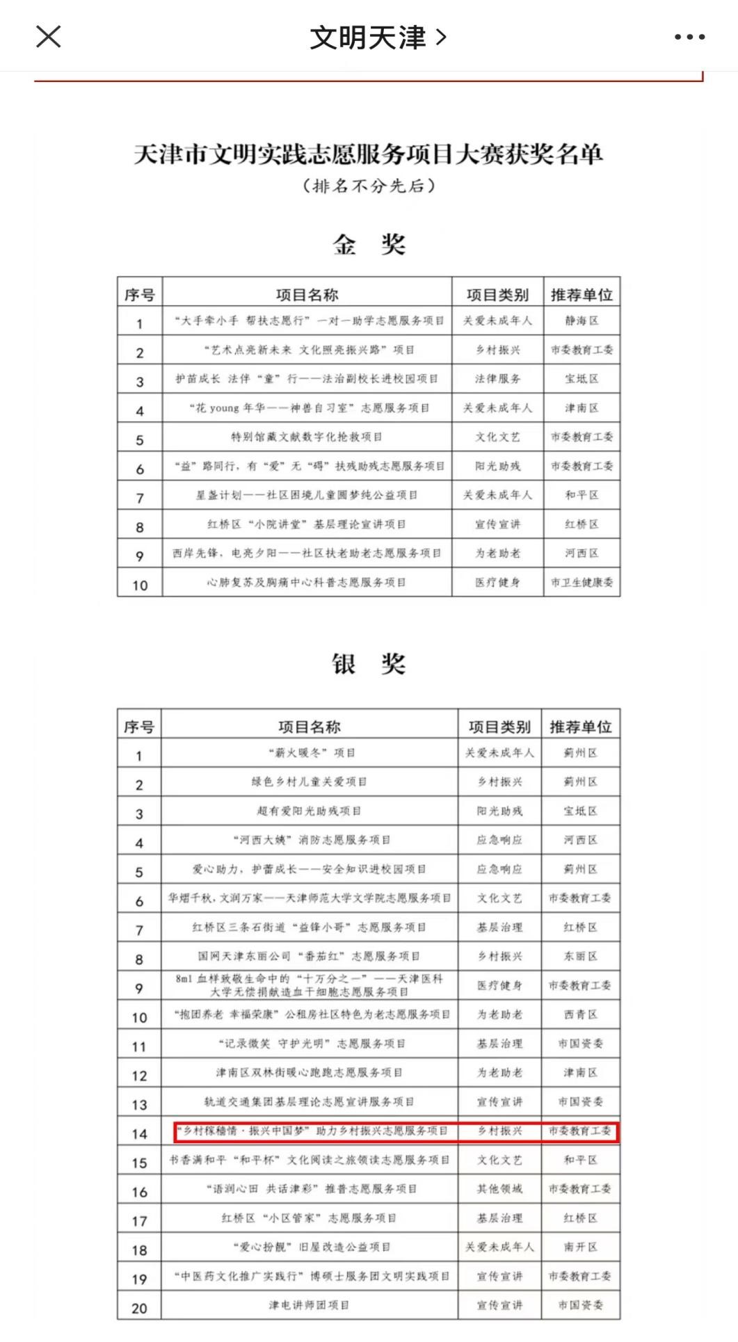 近日,2023年天津市文明实践志愿服务项目大赛举行,经市委教育工委推荐由永利3044官网选送的“乡村稼穑情·振兴中国梦”助力乡村振兴志愿服务项目荣获大赛银奖。
