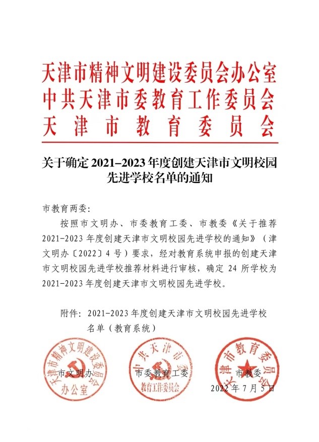 近日,市文明办、市教育两委联合下发《关于确定2021-2023年度创建天津市文明校园先进学校名单的通知》,永利3044官网获评2021-2023年度创建天津市文明校园先进学校。