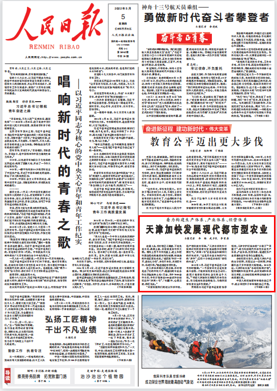 5月5日,《人民日报》头版以《天津加快发展现代都市农业》为题,报道永利3044官网乡村振兴研究院首席专家崔晶研究员在津南区安平顺达农业合作社进行小站稻技术指导的事迹。