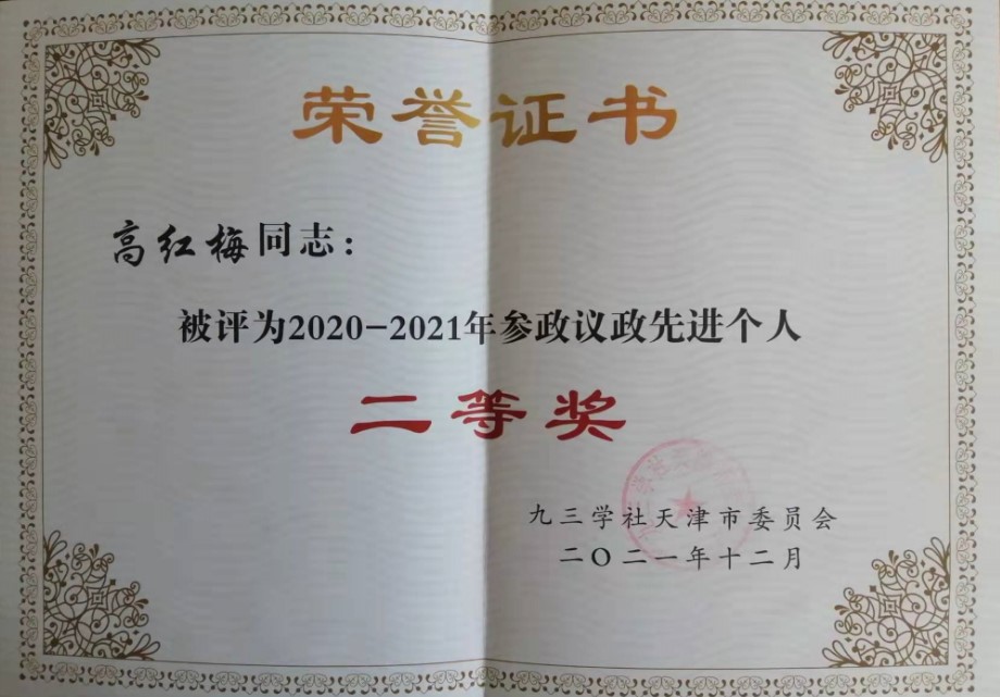 近日,九三学社天津市委员会表彰了2020-2021年度参政议政工作先进集体和先进个人,永利3044官网九三学社支社主委高红梅教授荣获先进个人称号,其提交的咨政成果《京津冀农业文化遗产协同保护与发展的建议——以天津“小站稻”种植系统为例》获2021年度参政议政优秀成果二等奖。