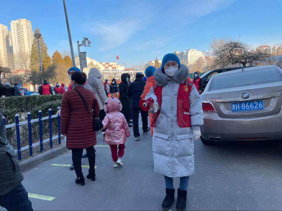 经过社区党委统一协调安排,1月12日中午,张静同志接到下沉社区协助居委会组织核酸检测的任务。来不及吃饭,她迅速赶赴核酸检测点,期间她根据安排按楼号引领居民有序下楼进行核酸检测,为确保每户家庭的每个成员都能按时进行检测,她需要往返上下楼多次,逐门通知提醒,确保不落一人,她细心地引导老人和幼童通过绿色通道,耐心解答问题,事无巨细地提醒注意事项,维持现场秩序。尽管天气很冷,双手被冻红,但张静同志依然坚守岗位职责,丝毫不松懈。