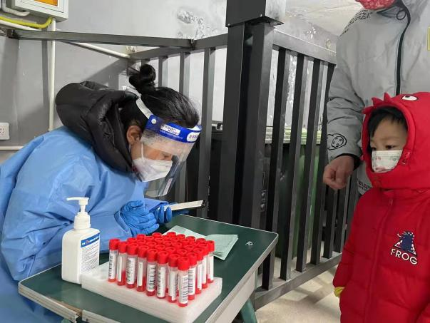 经社区安排,崔蕾同志主要负责的任务是在核酸筛查工作中辅助医护人员做身份核查与验证工作,同时帮助医护人员整理核酸试剂并封箱,确保社区核酸大筛工作的正常进行。作为一名教师党员她在筛查工作中一丝不苟、尽职尽责,从早上5点到岗开始进行社区居民身份验证,直至最后一名居民核酸检测完成,接着协助医生进行扫楼工作,确保每一位社区居民都能完成核酸采样。数九寒天,防护面罩上面的水气顺着面罩往下淌,一会就冻住了,身上贴着暖宝宝依然瑟瑟发抖,但是能成为抗疫的一份子,心是温暖的。