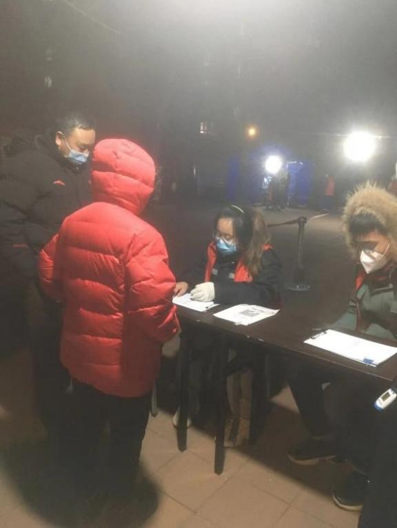 1月10号上午六点,志愿者集合完成,张佳怡负责帮助居民扫报道码和登记个人信息。深夜寒冬,温度骤降,她的手冻僵了,几乎没有办法控制笔的走向,但为了保障信息及时准确的登记,她从未间断,坚定地在信息登记册上整整齐齐地写了一页又一页。