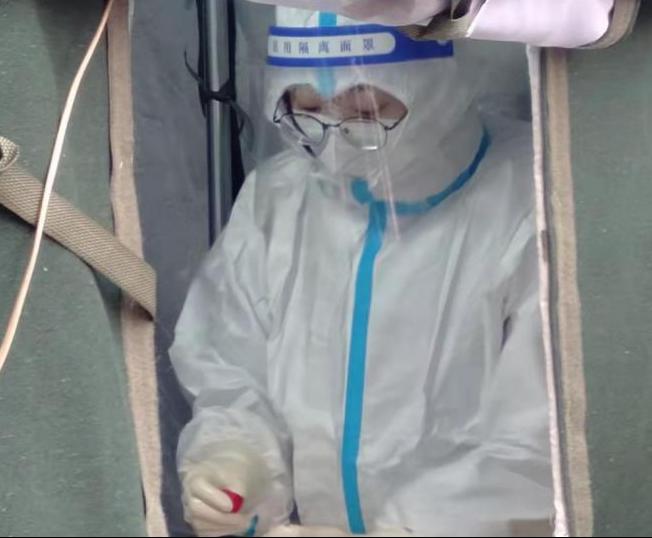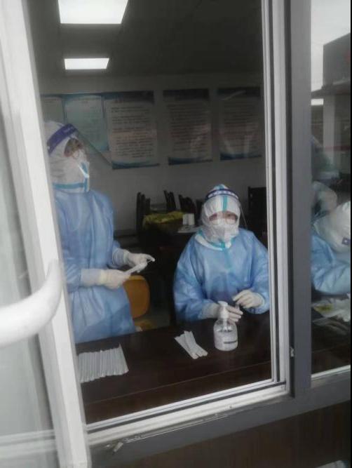在第三次大筛查时,她成为了医生的助手,体验了医生的辛苦。在每一次手部消杀之后与风形成的寒冷是刺骨的。面罩和口罩里的水蒸气,像是在里面洗了一把脸,但听到居民在测完后说的“谢谢,您辛苦了!”心里暖暖的。
