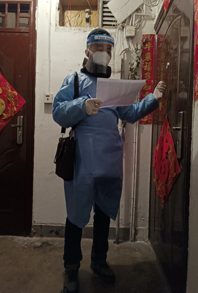 学院生物技术系教师党员杨红澎同志家住五大道街道华荫南里社区,该社区独守老人居多,信息采集获得困难。为减轻社区工作人员和医护人员的负担,杨红澎老师挺身而出,不畏严寒,凌晨5点就主动走向检测一线,协助维持秩序、为居民登记信息、爬楼敲门通知居民,为腿脚不便的老年人、残疾人士等特殊群体提供了暖心服务。杨老师表示:作为一名党员,要发挥先锋模范带头作用,主动担当作为,冲在疫情防控前线,当好居民疫情防控‘守门员’。