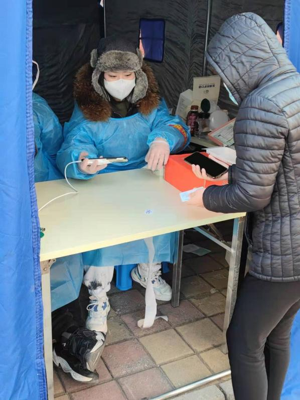 尹丹凤主要负责被检测人员的信息登记和维持秩序,从凌晨五点开始工作,尽管寒风凛冽,手脚都被冻僵了,志愿者们也没有一丝抱怨,尹丹凤说:“有许多大爷大妈们看我登记时,手冻得都要握不住笔了,就主动把他自己的手套脱下来给我们带,这让我非常感动。”居民积极响应号召,出门到指定地点做核酸检测,大家有序排队。这样的忙碌一直持续到下午三点,虽然志愿者的工作结束了,医护人员还要继续为腿脚不便的老人、孕妇等特殊人群上门做核酸检测。正因为有了大家的积极配合,团结一心,核酸筛查工作才能圆满完成。