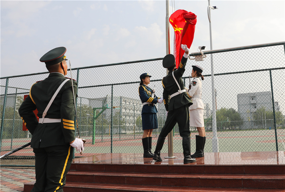 开学典礼在师生高昂齐唱国歌声中拉开帷幕。随后,出校旗,奏唱校歌。