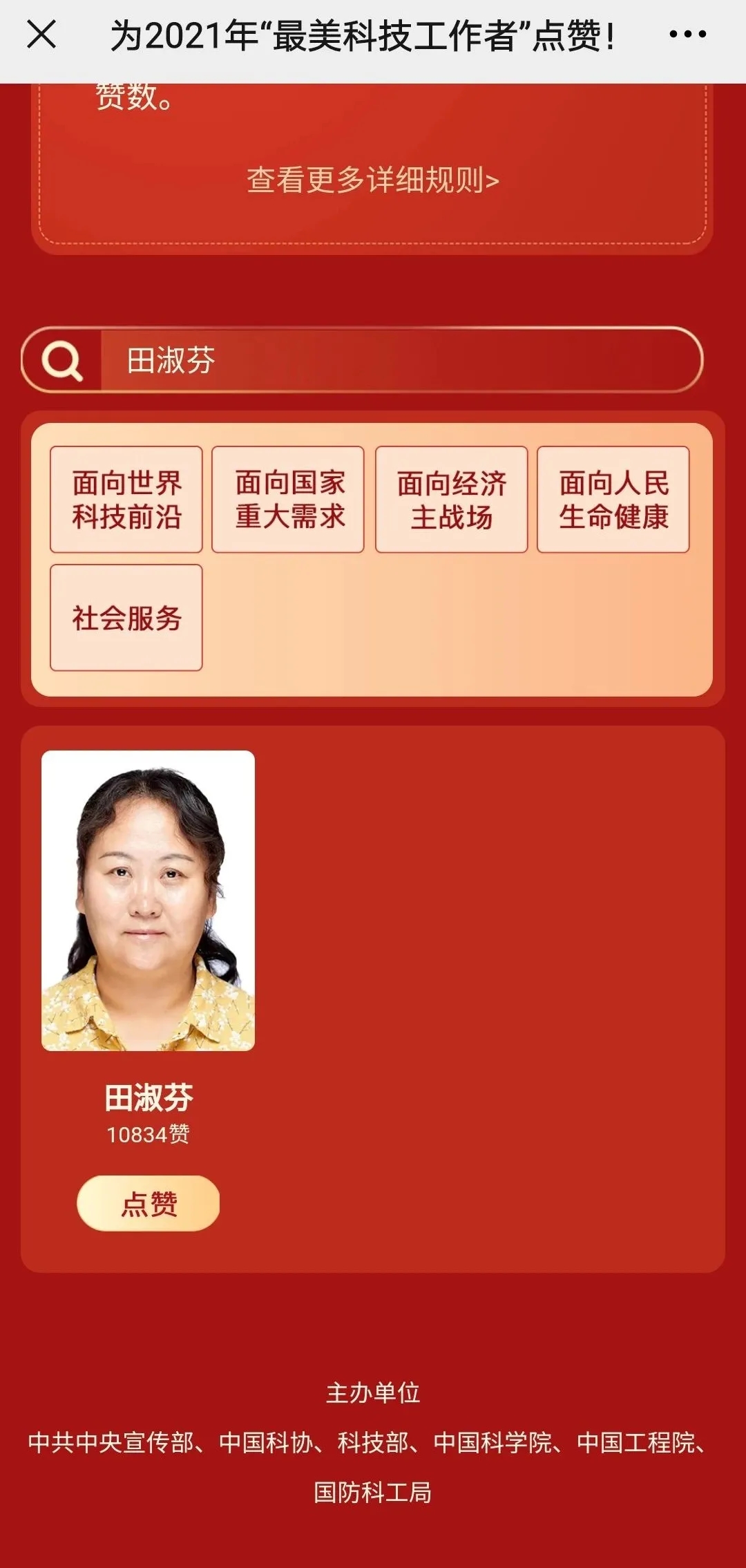 日前,由中共中央宣传部、中国科协、科技部、中国科学院、中国工程院、国防科工局主办的2021年“最美科技工作者”学习宣传活动正在进行中,永利3044官网田淑芬研究员位列其中,目前已经进入点赞环节,投票时间为7月30日至8月30日24时,每人每日可点赞10次。为大力宣传永利3044官网科技工作者,大家一起为田淑芬研究员点赞吧!
