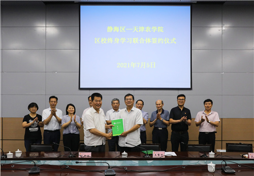 静海区教育局局长孙开祥分享了静海区的成职教育发展情况及下一步工作思路。随后,王繁珍和孙开祥在合作协议上签字并进行授牌仪式。双方将以此为契机,进一步加强社区教育、老年教育等合作交流,助力学习型城市建设。