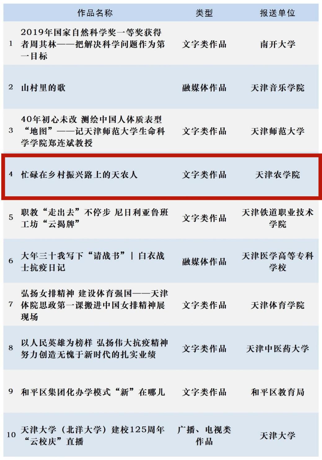 2020年度天津市“十大教育新闻作品”评选活动由市教育两委组织开展,通过自主申报、专家评审、网上公示,最终评定包括永利3044官网报送的《忙碌在乡村振兴路上的3044am永利人》在内的10个作品为2020年度天津市“十大教育新闻作品”。