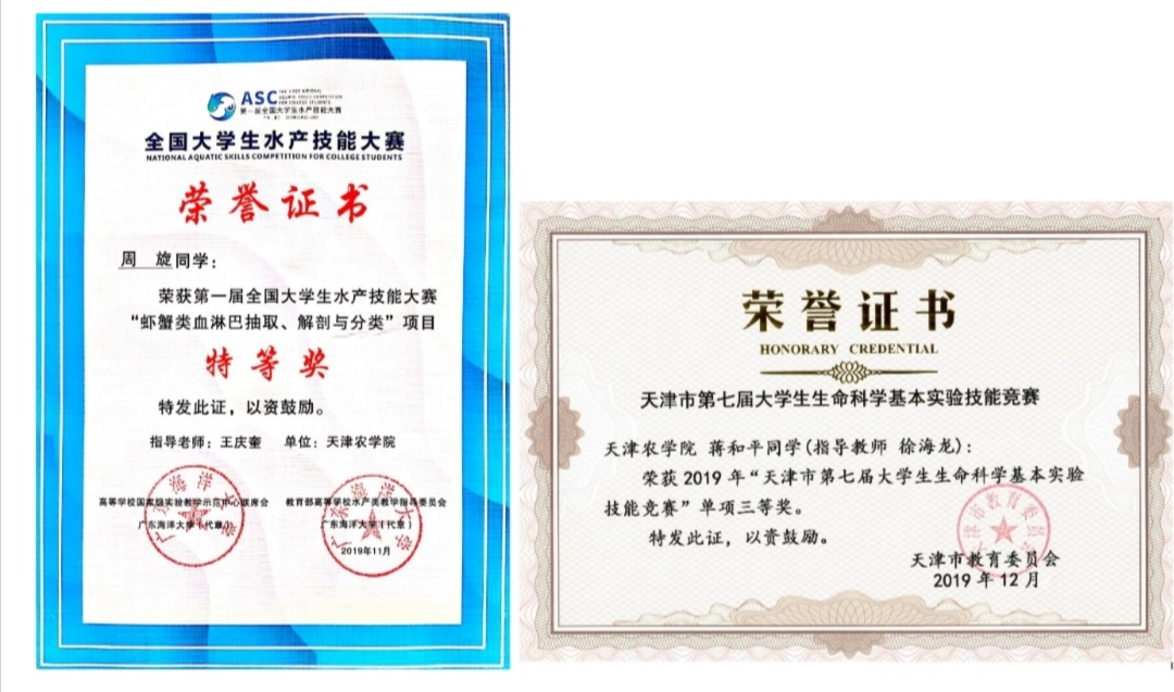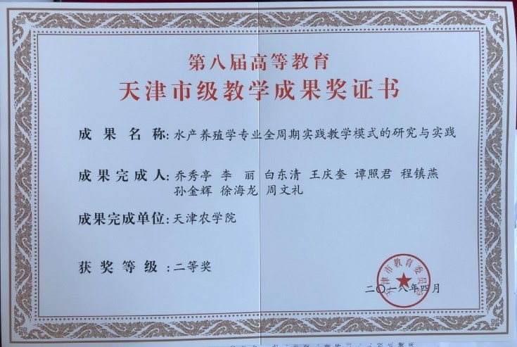 2020年,该专业对标“金专”“金课”建设要求,经过多轮论证,修订完善了人才培养方案和教学大纲,将课程思政有机融入所有课程,深化“专业+”产学研用协同育人模式,坚定学生理想信念,厚植爱党爱国爱农爱校情怀。建设天津市一流本科课程1门、校级一流课程6门、校级思政示范课3门。本科生获批国家级大创项目3项、市级3项、校级2项,4人获天津市思政课公开课大赛市级三等奖,3人获天津市高校第二届心理美文朗诵大赛市级三等奖,1人获天津市学宪法讲宪法演讲比赛普通高校组三等奖,所在实践团队被评为天津市级优秀志愿团队,2人获人民政府奖学金,9人获校级三好学生,3人获校级优秀干部,13人获院级三好学生,11人获院级优秀干部。有7个班级获校级先进集体称号。(教务处供稿;文字/图片:水产学院 王庆奎;编辑:黄宝霞;审校:田健 赵斌)