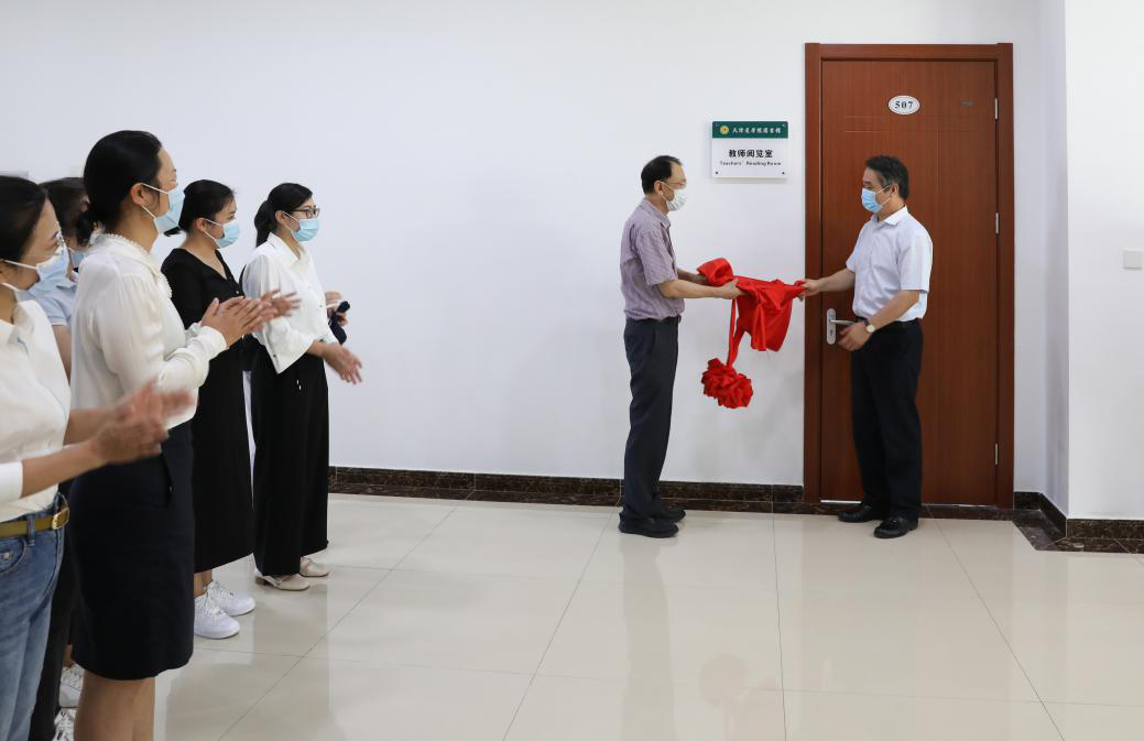 在图书馆五楼,葛英秋和王延文共同为教师休息室启动揭牌。