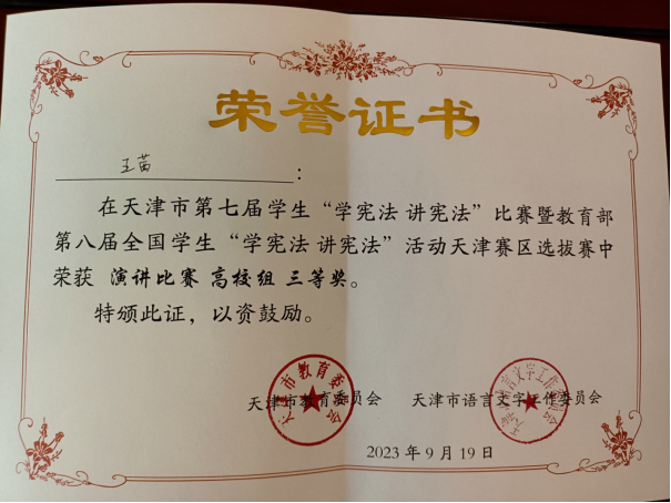 近日,天津市教育委员会公布天津市第七届学生“学宪法 讲宪法”比赛暨教育部第八届全国学生“学宪法 讲宪法”活动天津赛区选拔赛比赛结果,永利3044官网经济管理学院2022级公共事业管理学生王茜,荣获演讲比赛高校组三等奖。