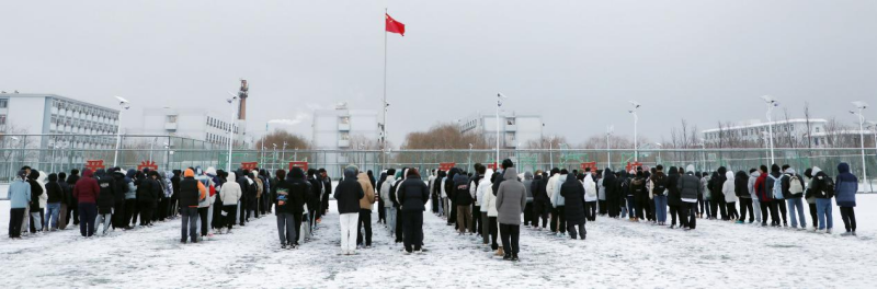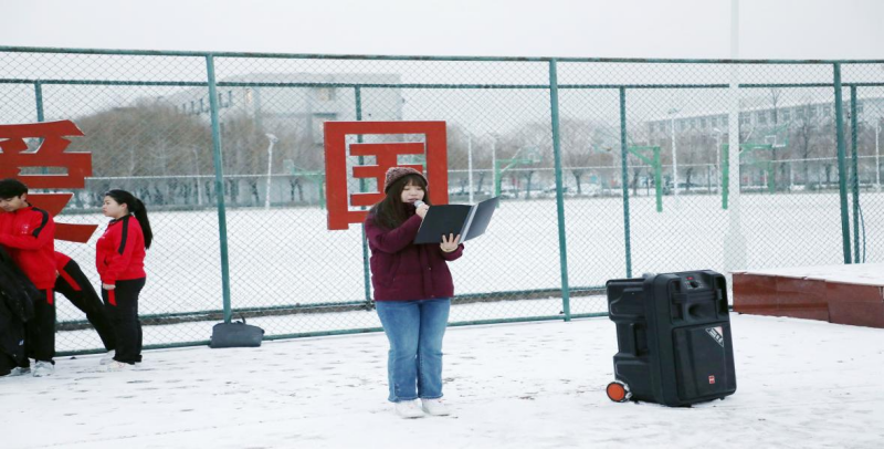 清晨飘扬的雪花,为升旗仪式增添了几分庄严肃穆,全体师生面向国旗肃立致礼。随着《义勇军进行曲》的响起,鲜艳的五星红旗在全体师生的注目下冉冉升起,在凛冽的寒风中飘扬。