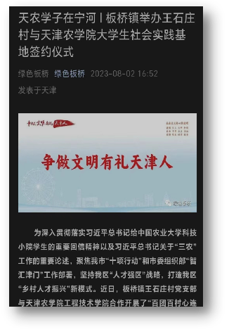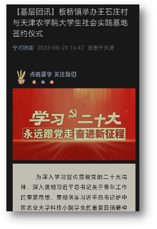 回访毕业生也是暑期社会实践的任务之一。学院遴选王石庄村作为暑期社会实践对象,还是因为该村党支部书记兼村委会主任是我院优秀校友。2019年毕业于新能源科学与工程专业的陈泽学长给同学们讲述毕业后考取宁河农村党务助理到成长为村党支部书记和村委会主任的历程,鼓励大家奋发学习,励志服务乡村振兴。为了巩固社会实践成果,学院团委和王石庄村党支部签署了大学生社会实践基地协议,商议了长期合作事宜。暑期社会实践贴合农业农村发展实际,受到了农民欢迎,也受到了当地政府相关部门的关注。宁河团区委和板桥镇政府分别在官方微信公众号“宁河团委”和“绿色板桥”报道了学院社会实践的消息。