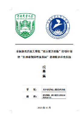 2023年7月,全国涉农高校工学院联合举办“双百双万双新”行动计划暨“扎根希望田野服务团”暑期联合社会实践启动仪式。工程技术学院积极响应,深入天津宁河区开展实践活动。10月份,实践成果“逐梦青春,助力津沽大地农业农村现代化”被纳入全国涉农高校工学院暑期联合社会实践成果集。