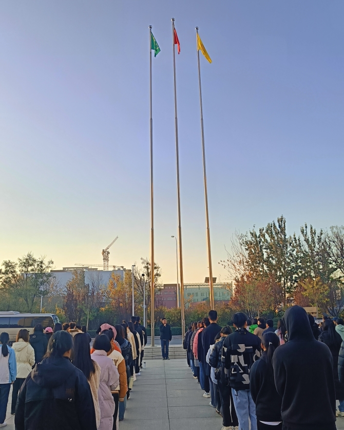 7点20分整,国旗护卫队队员迈着整齐一致、铿锵有力的步伐,向着升旗台走去。五星红旗伴随着国歌声冉冉升起,师生们面向国旗肃立行注目礼,高唱国歌,共同感受这一庄严而自豪的时刻。五星红旗迎风飘扬,庄严的国歌在耳边阵阵回荡。在场的人文学子以不负青春的志气、不负韶华的骨气、不负时代的底气,以青春之名发出“挺膺担当 强国有我”的时代之音。