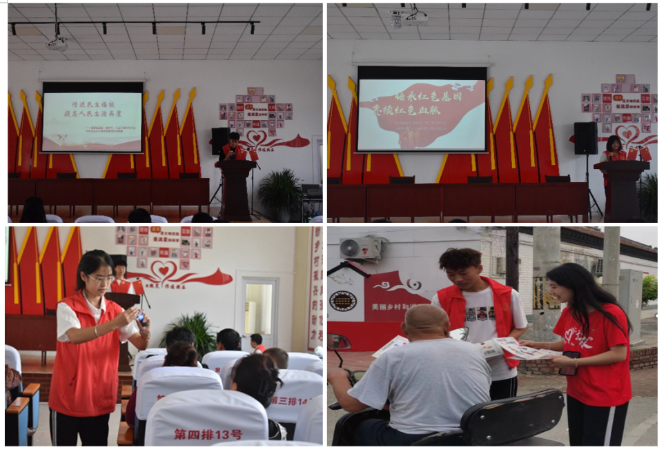 理论宣讲团队的同学们通过精心策划,将上刘庄村的风土人情和历史发展融入到宣讲材料中,向上刘庄村的党员代表和村民代表们宣传习近平新时代中国特色社会主义思想和习近平法治思想,并向上刘庄村赠送宣传海报;“绿色循环之垃圾华丽蝶变”京津冀协同战略实践行团队向代表们讲解垃圾分类绿色循环知识,并现场展示垃圾“蝶变”小实验、科普科学小知识。宣讲之后,队员们走向村巷街道,向村民发放并讲解宣传单,通过介绍垃圾分类的重要性推动垃圾分类和资源回收的普及,减少对环境的污染和资源的浪费。