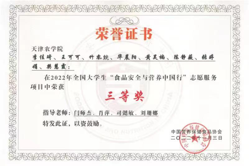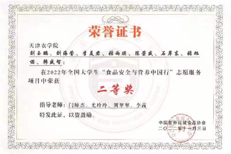 经过六个月的激烈角逐,由食品质量与安全专业刘玉鹏等8名同学组建的“致爱”社会实践团、食品科学与工程专业李佳琦等8名同学组成的“汲知”社会实践团分别获得了全国二等奖和全国三等奖的优异成绩。