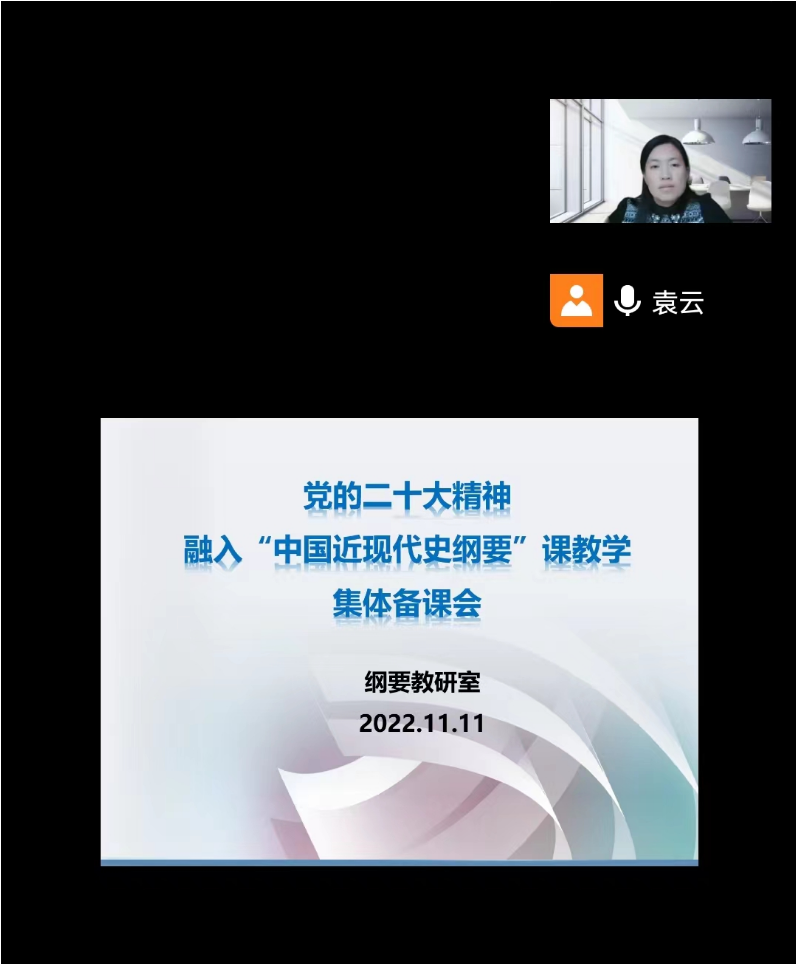 11月11日下午,中国近现代史纲要教研室全体教师举行线上集体备课会,交流研讨如何将党的二十大精神融入“中国近现代史纲要”课程教学。马克思主义学院党总支书记王延年、院长夏建海参加。