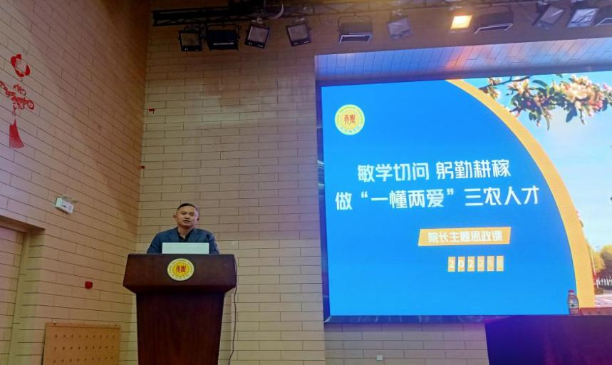 谢晓东在大会上讲授了“敏学切问,躬勤耕稼,做‘一懂两爱’三农人才”专题思政课。分别从学院概况、专业特色、学科建设、校园学习生活等方面切入,教育引导广大同学思源奋进,秉承校训,努力争做“一懂两爱”三农人才,用实际行动为农业农村现代化、乡村全面振兴贡献力量,向党的二十大献礼。