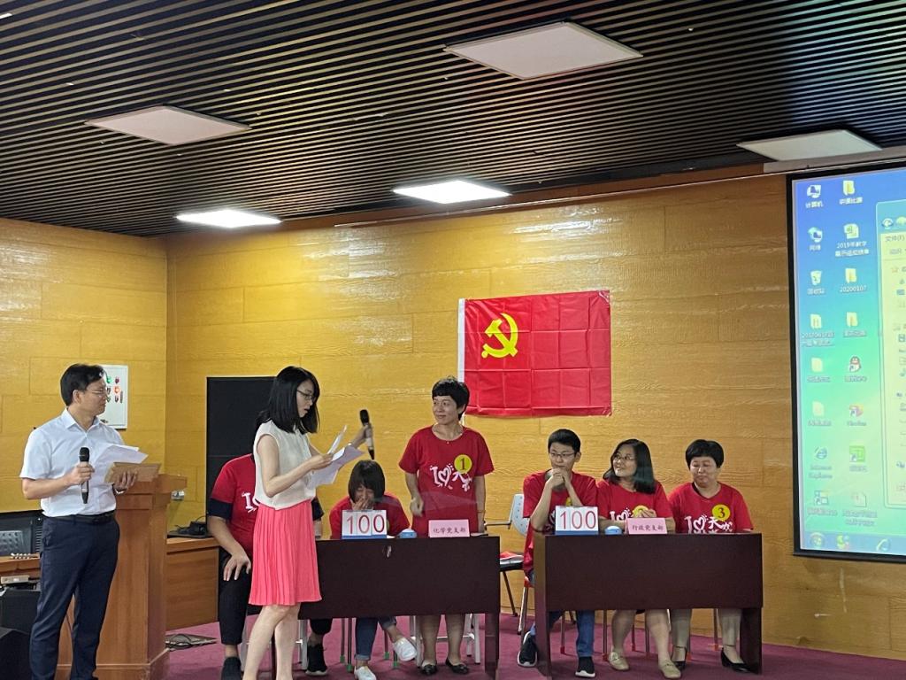 活动伊始,院党委书记杨秀红同志带领全体党员面向党旗庄严宣誓重温入党誓词,随后歌曲《没有共产党就没有新中国》应声响起,在大家共同演唱下活动拉开帷幕。所属五个党支部书记背向屏幕随机叫停选定参赛选手,现场组队成功后正式进入比赛环节。本次比赛由必答题和抢答题组成,选手每人从信封中抽选一题作答,指定四本书目中节选文段及猜红歌作为抢答题,在紧张激烈的角逐中评选出一二三等奖,党委班子成员为参赛选手一一颁奖,最后以大家共同演唱《歌唱祖国》结束。