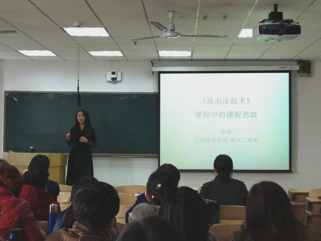 工程技术学院教师李谨以承担的《高电压技术》为例进行了优秀案例分享。李谨从“公开呼吸机等设备相关的33项国际标准”的一条新闻入手,挖掘新冠疫情下中国作为负责任大国的实力和担当的思政元素;以高压输电线路上的四川大凉山彝族电力工人为切入点,展现了我国新时代脱贫攻坚取得的阶段性成果,激励同学为家乡建设添砖加瓦;从朋友圈推送的“带电作业的大国工匠王进”拓展,介绍我国特高压输电方面的辉煌成就,鼓励同学弘扬敬业、精益、专注、创新的工匠精神。