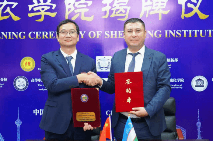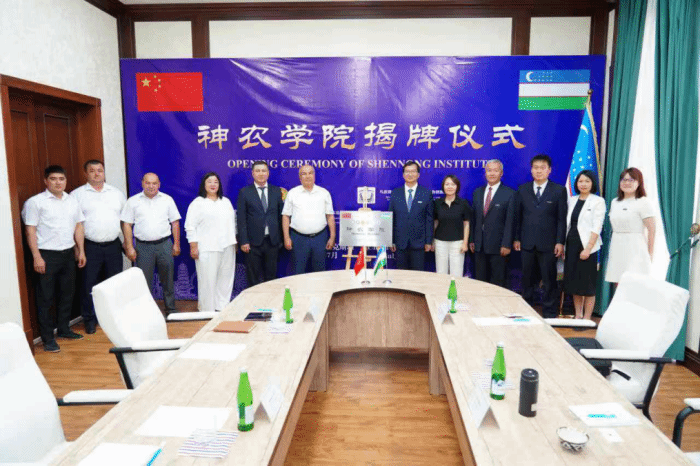 金危危在致辞中指出,借此次揭牌仪式的契机,我们将与各位乌兹合作伙伴一道,共同推进“神农学院”招生及品牌建设。乌兹别克斯坦合作高校、科研机构以“神农学院”的品牌项目在当地进行招生,学生可以通过“2+2”或“3+1”项目及短期学习的形式来津学习。中乌合作方将在园艺、水产、环境设计、水文与水资源工程等专业联合开展本科层次的合作办学。我们将在乌兹别克斯坦和中国政府的关怀和领导下,以此次携手为新的起点,依托优良的办学条件、先进的办学理念,尽快创出形象、创出品牌,共同将“神农学院”打造成两国合作办学的示范和标杆,打造成在两国农业教育领域具有一定影响力的农业教育机构。正如乌兹别克斯坦谚语“友谊的土壤里,总会长出甜蜜的果实”,这些合作正孕育着丰饶的未来。相信“神农学院”的项目不仅可以提高我们共同的办学水平,增强合作高校在农业领域教育的竞争力,促进相关产业增收与经济发展,同时可以加快促进双方现代农业教育体系和科研体系的发展。