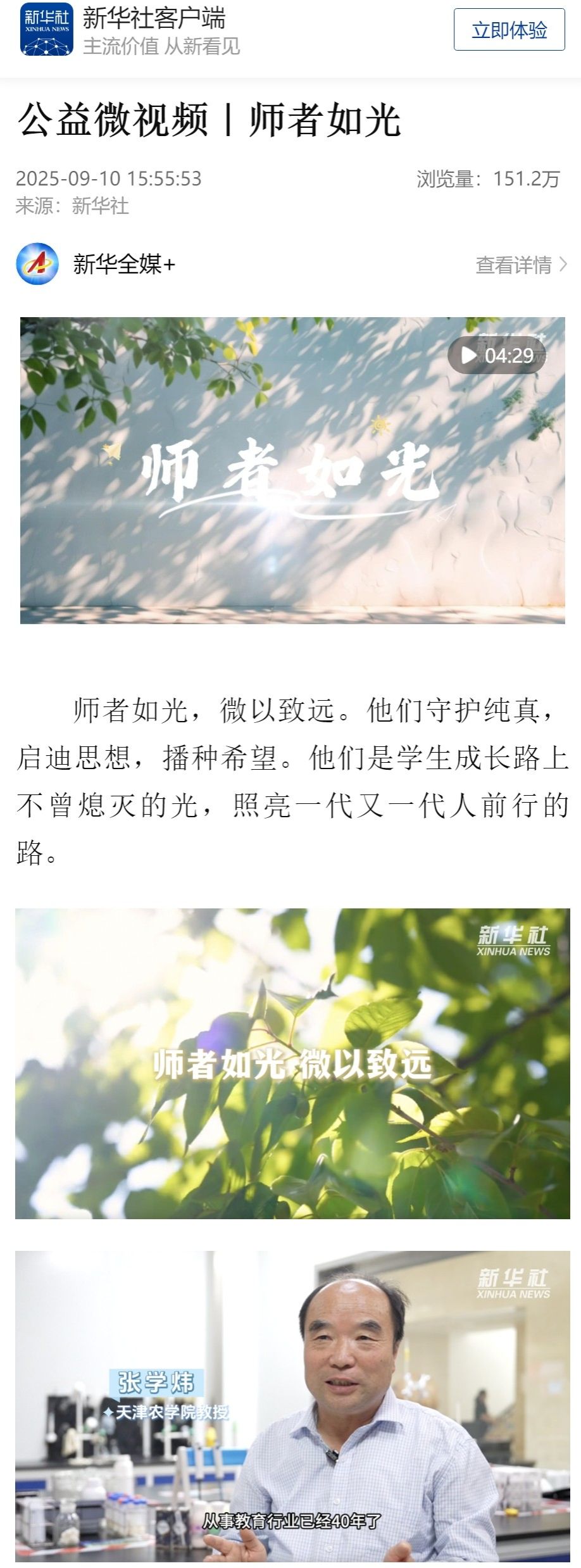 连日来,在第41个教师节到来之际,新华社、新华网、中央广播电视总台国际在线、人民网、天津日报视频号、天津广播电视台、津云、津门教育等多家主流媒体在“教师节专题新闻”中持续对永利3044官网动物科学与动物医学学院张学炜老师教书育人工作进行了矩阵式报道,产生了较大的社会影响力。