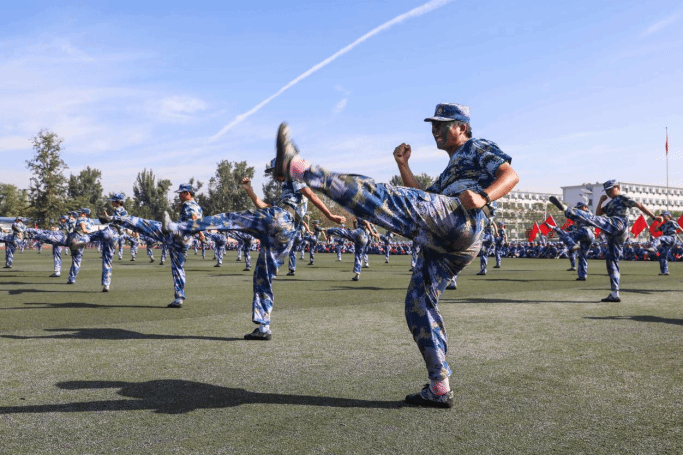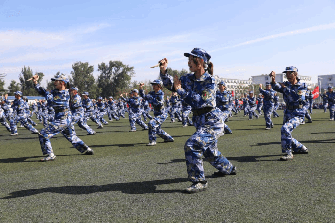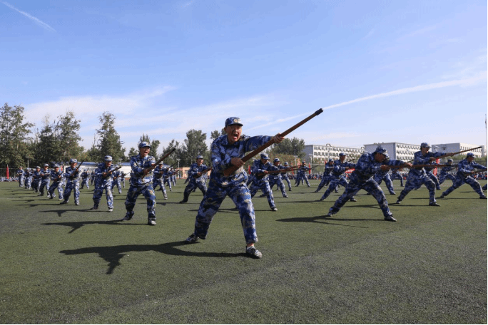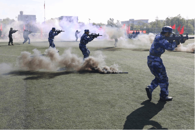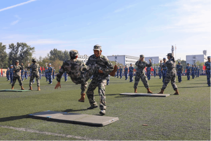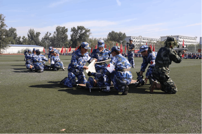 军事技能成果汇报将气氛推向高潮。擒敌拳刚劲有力、刺杀操突刺迅猛、匕首操攻防兼备,每招每式皆见训练功底;班组战术与战场救护展示中,学员分工协作,隐蔽接敌、伤员转运等流程行云流水,充分彰显军事素养与团队能力,现场掌声不断。