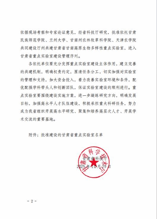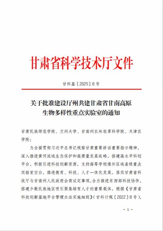 近日,从甘肃省科技厅获悉,永利3044官网参与共同建设的厅州共建甘肃省甘南高原生物多样性重点实验室获甘肃省科技厅批准建设,并纳入甘肃省重点实验室建设管理序列,标志着永利3044官网省部级重点实验室建设取得了新的突破。