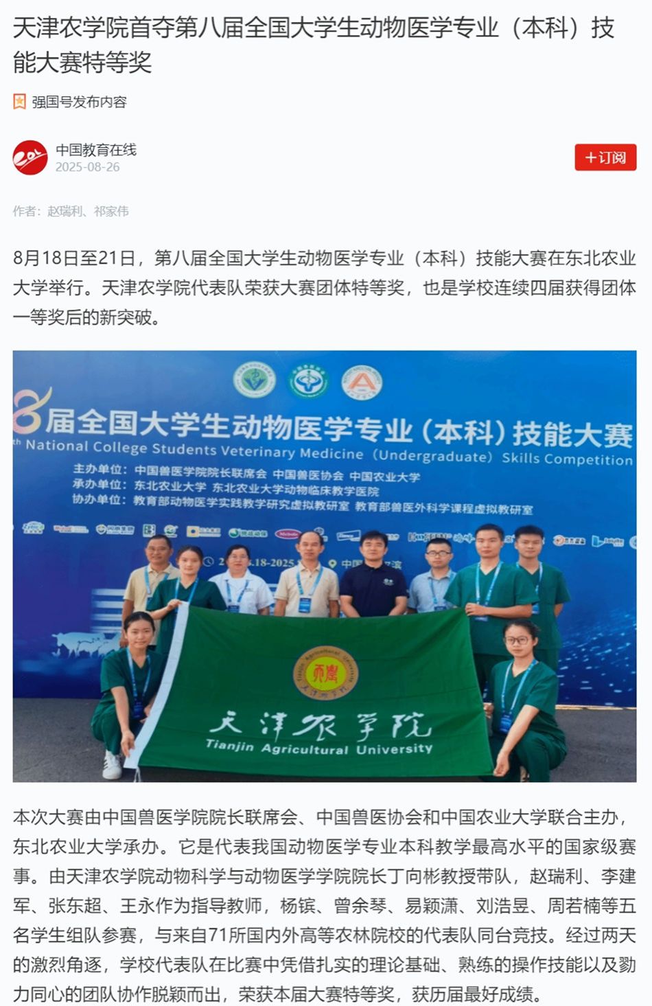 2025年8月26日,学习强国平台、中国教育在线网报道,永利3044官网首夺第八届全国大学生动物医学专业(本科)技能大赛特等奖,也是学校连续四届获得团体一等奖后的新突破。