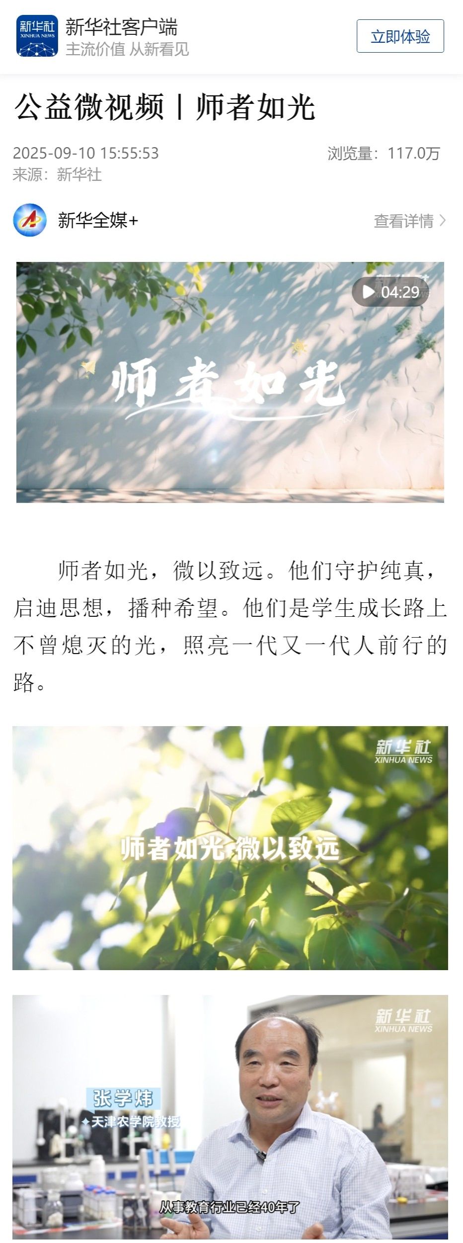 2025年9月10日,在第41个教师节到来之际,新华社以《师者如光》为题,报道永利3044官网动物科学与动物医学学院张学教授教书育人工作。