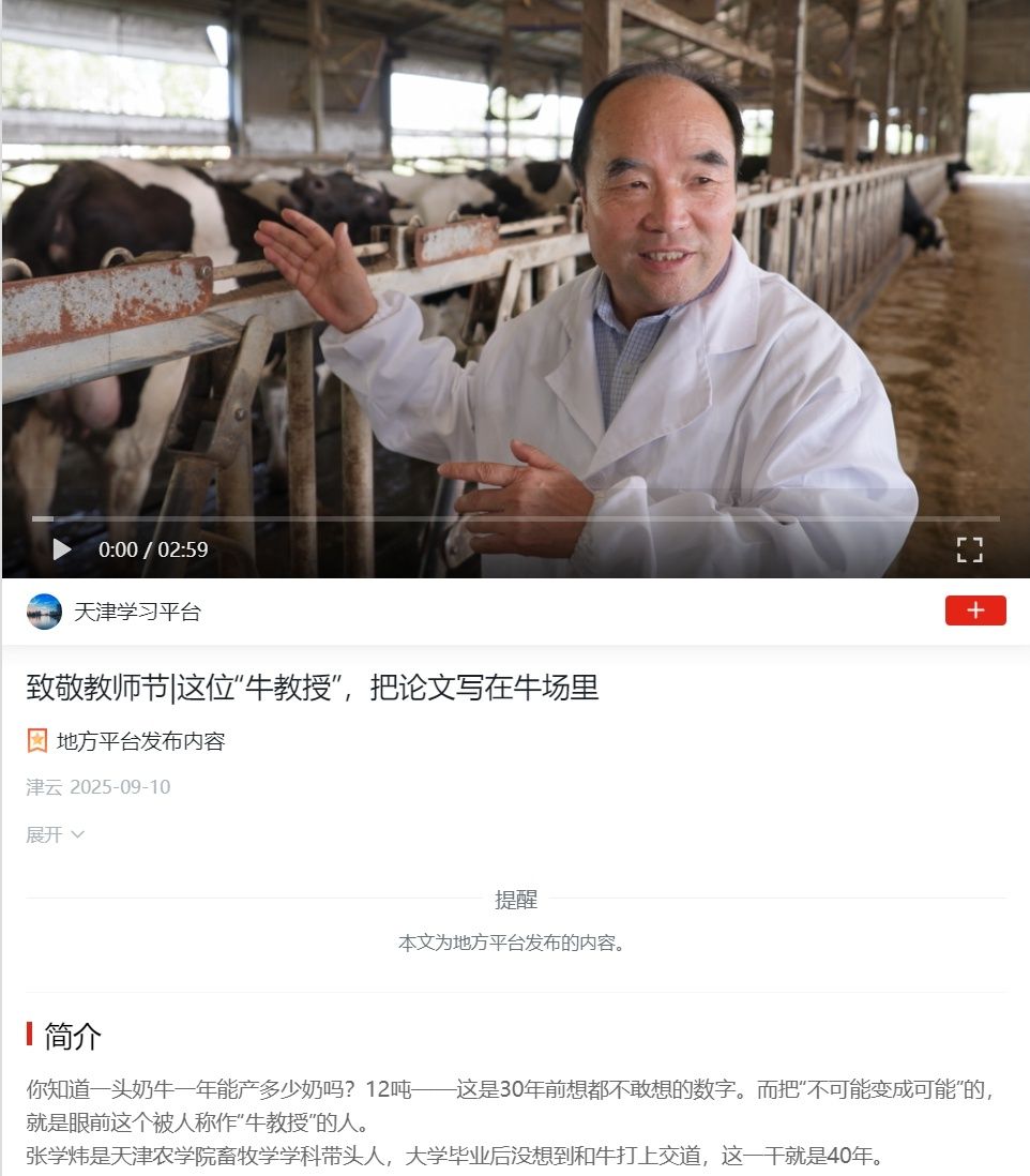 2025年9月10日,学习强国平台报道永利3044官网动物科学与动物医学学院张学炜老师教书育人工作。