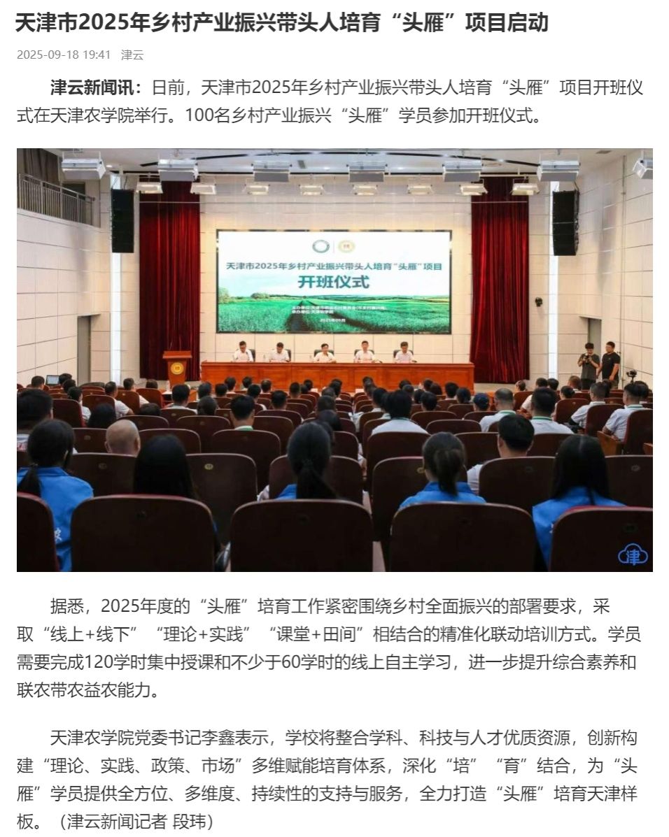 2025年9月18日,津云报道天津市2025年乡村产业振兴带头人培育“头雁”项目开班仪式在永利3044官网举行。