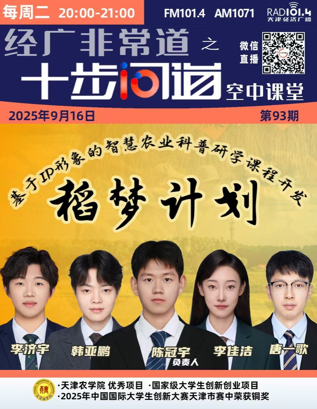2025年9月16日,天津经济广播、天津经济广播《十步问道空中课堂》、十步问道公众号报道永利3044官网园艺园林学院温文、张俊老师指导“稻梦计划”基于IP形象的智慧农业科普研学课程开发。