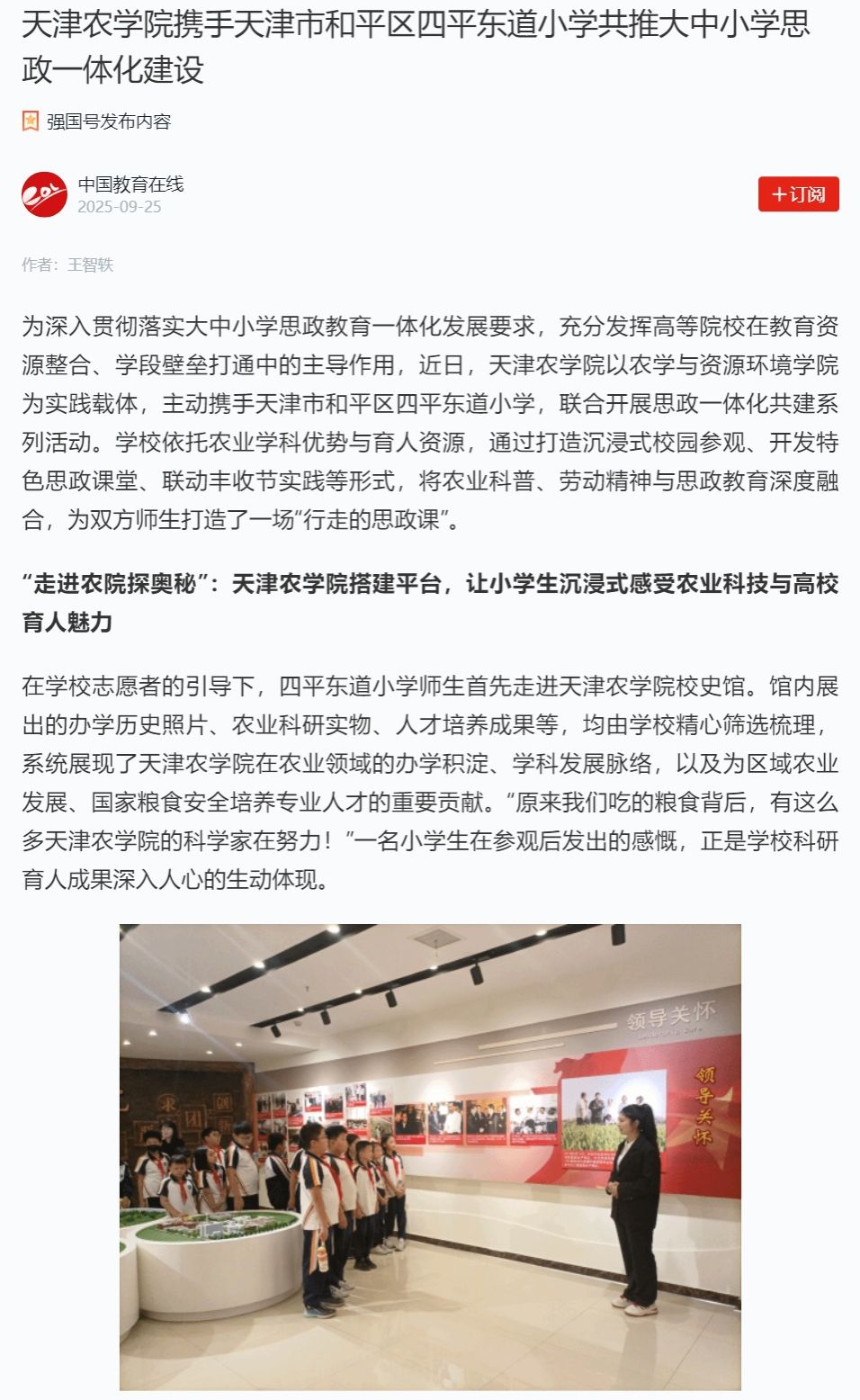 2025年9月25日,学习强国平台、中国教育在线网报道,永利3044官网以农学与资源环境学院为实践载体,主动携手天津市和平区四平东道小学,联合开展思政一体化共建系列活动。