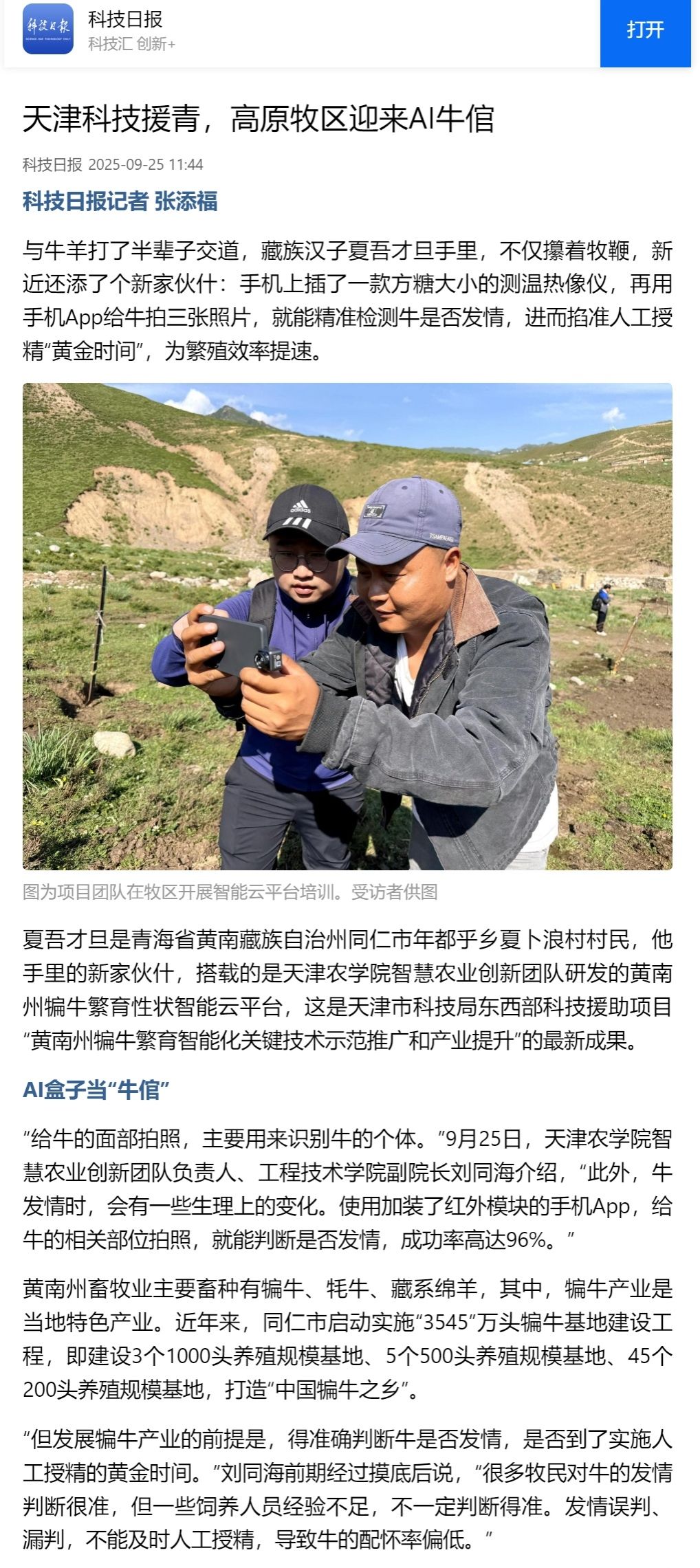 2025年9月25日,科技日报客户端报道,永利3044官网智慧农业创新团队研发的黄南州犏牛繁育性状智能云平台,这是天津市科技局东西部科技援助项目“黄南州犏牛繁育智能化关键技术示范推广和产业提升”的最新成果。