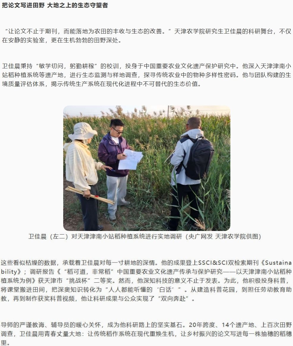2025年10月13日,央广网客户端以《青春华章|以奋斗姿态激扬青春、实现梦想》为题,报道永利3044官网研究生卫佳晨秉持“敏学切问,躬勤耕稼”的校训,投身于中国重要农业文化遗产保护研究中。他深入天津津南小站稻种植系统等遗产地,进行生态监测与样地调查,探寻传统农业中的物种多样性密码。他与团队构建的生境质量评估体系,揭示传统生产系统在现代化进程中不可替代的生态价值。
