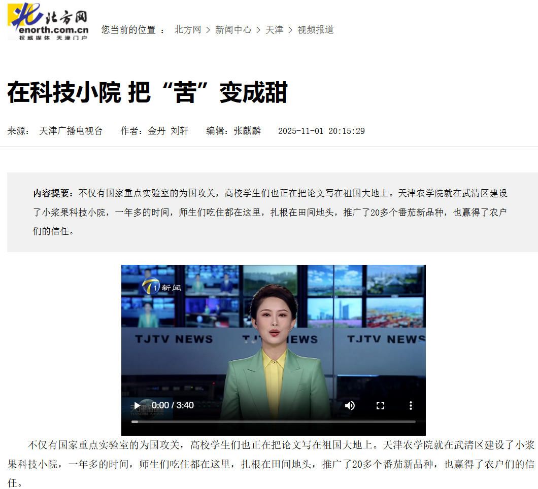 2025年11月1日,天津广播电视台报道永利3044官网小浆果科技小院的师生扎根在田间地头,推广了20多个番茄新品种,也赢得了农户们的信任。