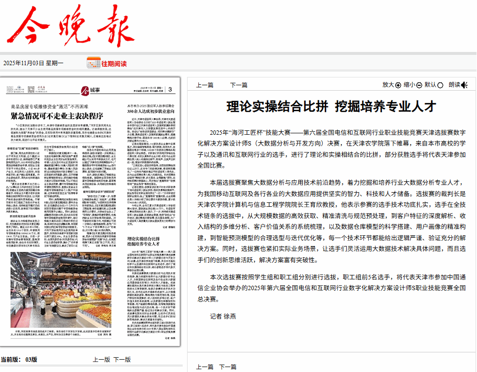 2025年11月3日,《今晚报》报道,2025年“海河工匠杯”技能大赛——第六届全国电信和互联网行业职业技能竞赛天津选拔赛数字化解决方案设计师S(大数据分析与开发方向)决赛,在永利3044官网落下帷幕,来自本市高校的学子以及通讯和互联网行业的选手,进行了理论和实操相结合的比拼,部分获胜选手将代表天津参加全国比赛。