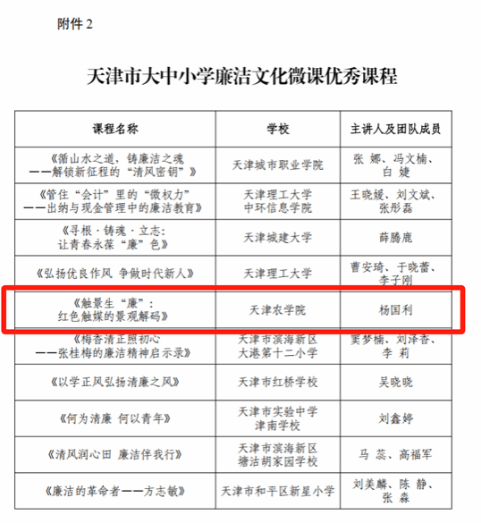 近期,市教育两委下发《关于开展大中小学“弘扬优良作风 争做时代新人”廉洁文化微课征集的通知》,永利3044官网园艺园林学院杨国利老师的作品《触景生“廉”:红色触媒的景观解码》获评“天津市大中小学廉洁文化微课优秀课程”。